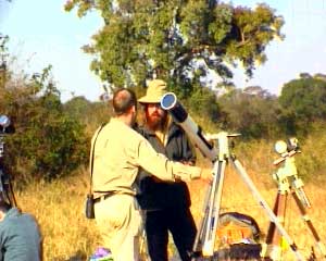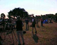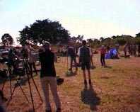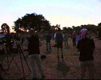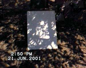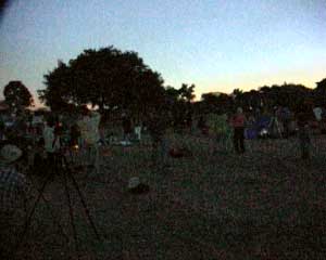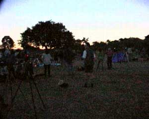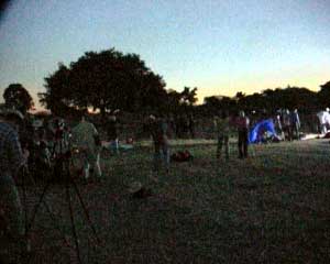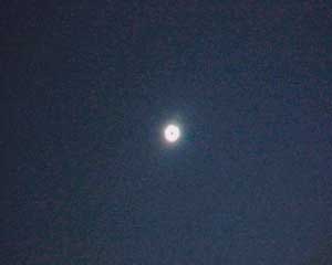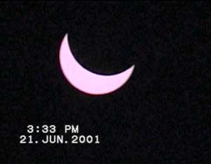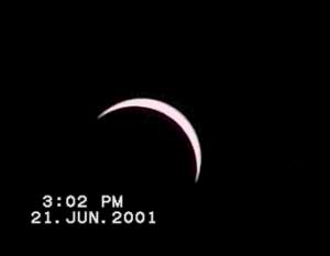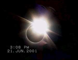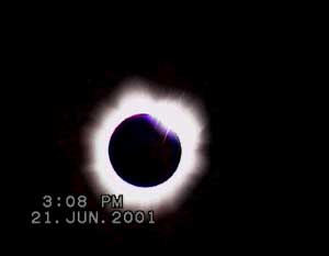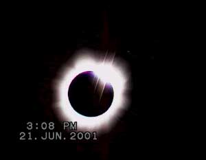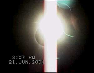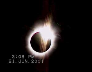 Bild links: 1m 15s vor der Totalität konnte ich den Filter von der Kamera nehmen. Das Bild entstand 1m 05s vor der Totalität. Bereits zu dieser Zeit ist die Korona zu ahnen, der Mond zeichnet sich deutlich als schwarze Scheibe ab und die Spannung steigt ins Unermessliche! Die restliche Sichel der Sonne ist noch viel zu hell für die Kameraeinstellungen (1/2000 Sekunde bei Blende 3.2). Durch die Frontlinse gibt es aber einige Reflexionen der Sonnensichel, anhand man die noch verbleibende Größe der Sonne erkennen kann. Der helle Streifen ist übrigens ein Artefakt des Kamera-CCD-Chips. So reagiert er bei krasser Überbelichtung. |